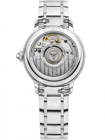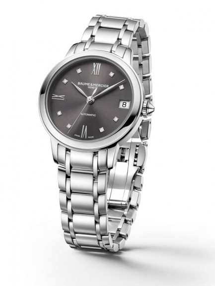 The Baume & Mercier 10610 Classima watch combines a 31mm round shaped stainless steel case and silver stainless steel bracelet with a push button deployment clasp. It has a grey analogue dial which is protected beneath sapphire crystal glass. Power is generated by the automatic movement. This model also has a water resistance of up to 50 metres.
