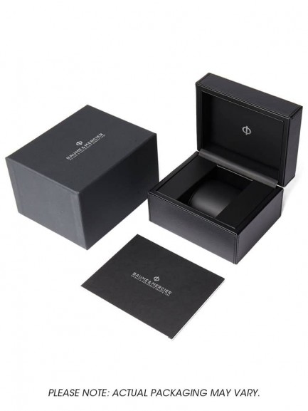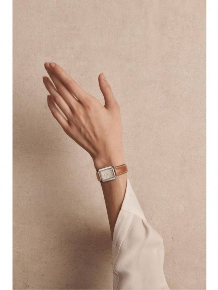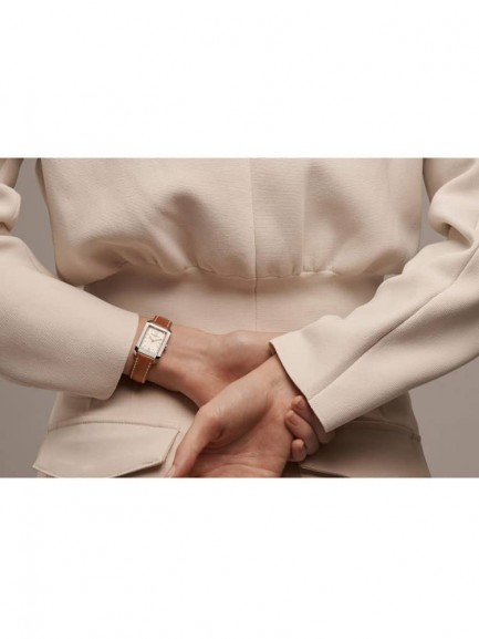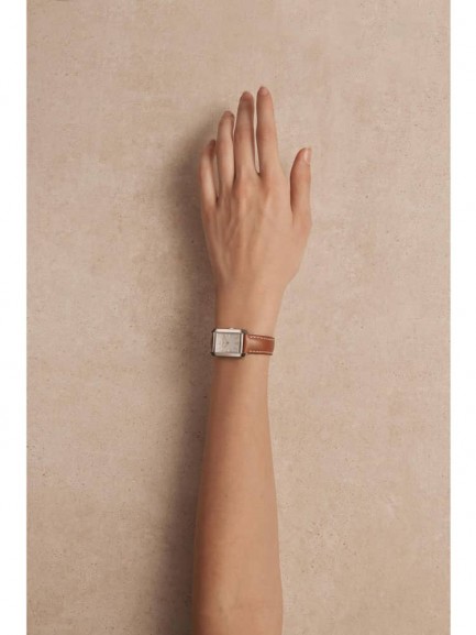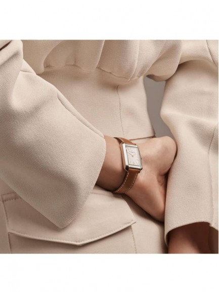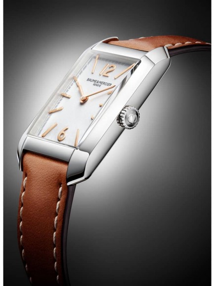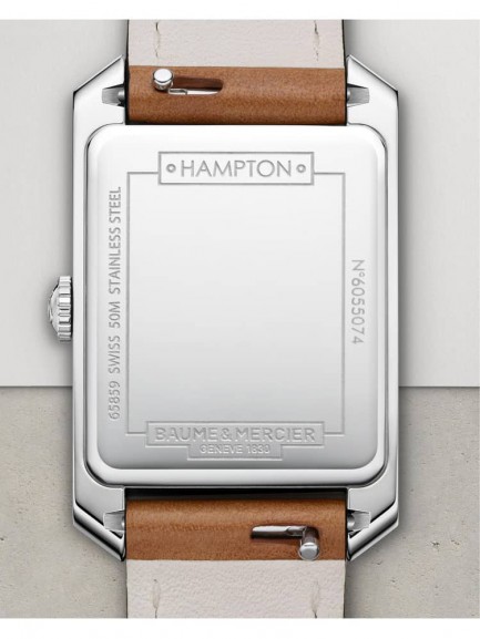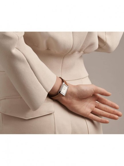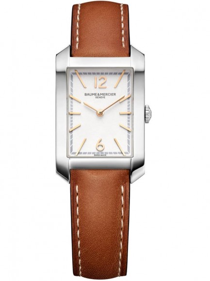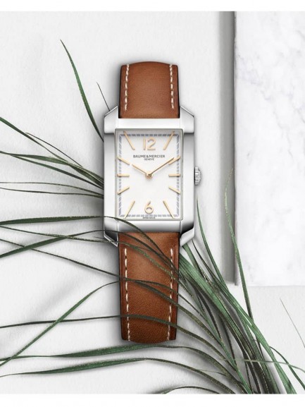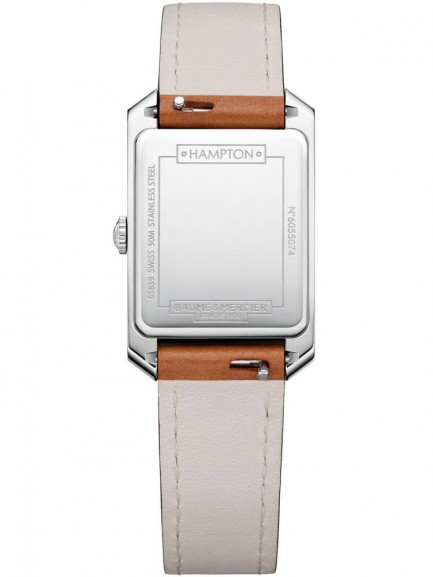 The Baume & Mercier 10472 Hampton watch combines a rectangular shaped stainless steel case and light brown leather strap with a buckle clasp. The case measures 22mm wide by 35mm long. It has a silver dial with gold tone hands and hour markers which is protected beneath curved scratch resistant sapphire crystal glass. Power is generated by the Swiss made MHH057 quartz movement. This model also has a water resistance of up to 50 metres.