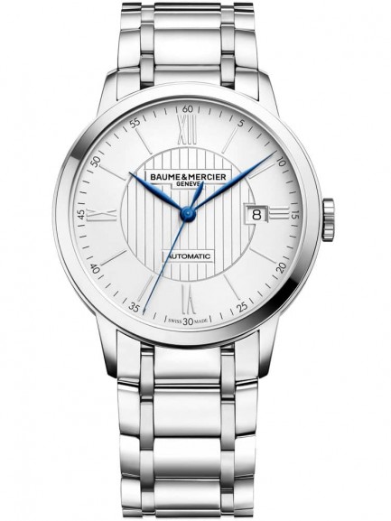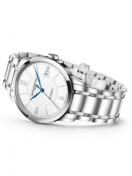 The Baume & Mercier 10215 Classima watch combines a 40mm round shaped stainless steel case and bracelet with a triple folding clasp and push button. It has a silver analogue dial with blue hands and a date display which is protected beneath scratch resistant sapphire crystal glass. Power is generated by the Swiss made Sellita SW200 automatic movement with 26 Rubies and a 38 hour power reserve. This model also has a sapphire crystal case back and a water resistance of up to 50 metres.