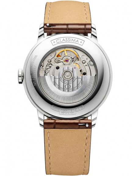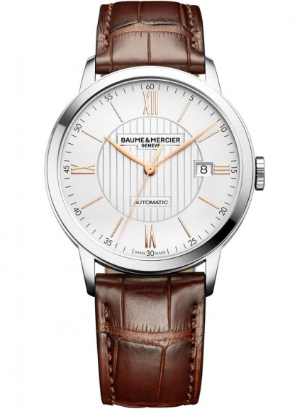 The Baume & Mercier 10263 Classima watch combines a 40mm round shaped stainless steel case and brown leather strap with a triple folding clasp and push button. It has a silver analogue dial with rose gold tone hands and a date display which is protected beneath scratch resistant sapphire crystal glass. Power is generated by the Swiss made Sellita SW200 automatic movement with 26 Rubies and a 38 hour power reserve. This model also has a sapphire crystal case back and a water resistance of up to 50 metres.