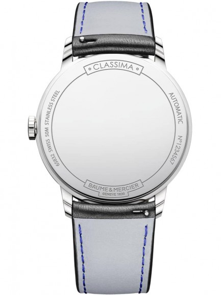 The Baume & Mercier 10453 Classima watch combines a 42mm round shaped stainless steel case and black leather strap with a traditional buckle. It has a black analogue dial which is protected beneath sapphire crystal glass. Power is generated by the automatic movement. This model also has a water resistance of up to 50 metres.