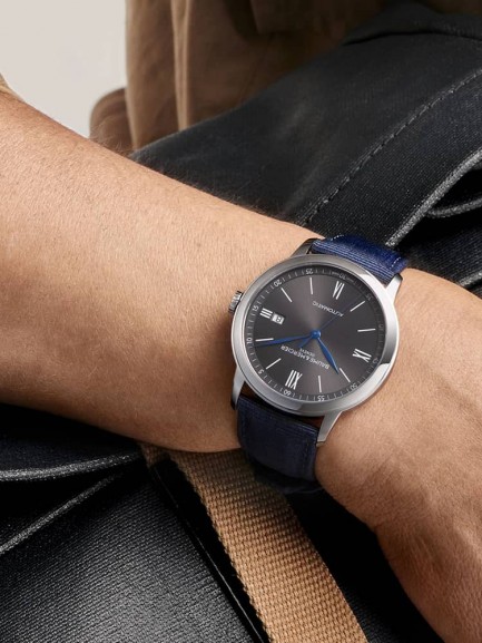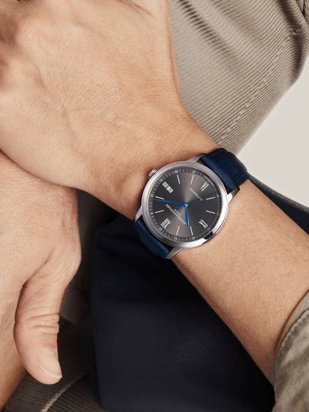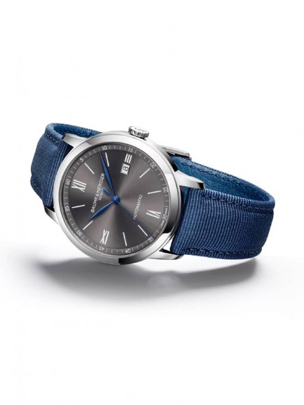 The Baume & Mercier 10608 Classima watch combines a 42mm round shaped stainless steel case and blue fabric strap with a traditional buckle. It has a slate grey analogue dial with a date display which is protected beneath scratch resistant sapphire crystal glass. Power is generated by the Swiss made Sellita SW200 automatic movement with 26 rubies and a power reserve of up to 38 hours. This model also has a water resistance of up to 50 metres.