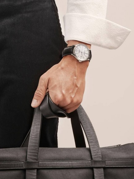 The Baume & Mercier 10518 Clifton watch combines a 40mm round shaped stainless steel case and black leather strap with a triple folding clasp and push button. It has a white analogue dial with a date display which is protected beneath scratch resistant sapphire crystal glass. Power is generated by the Swiss made automatic movement with a 120 hour power reserve. This model also has a sapphire crystal case back and a water resistance of up to 50 metres.