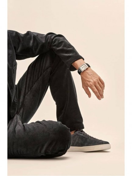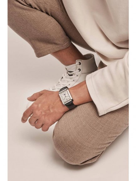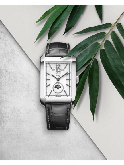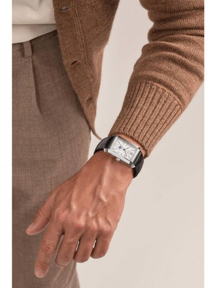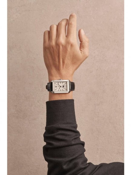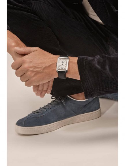 The Baume & Mercier 10523 Hampton watch combines a rectangular shaped stainless steel case and black leather strap with a triple folding clasp and push button. The case measures 31mm wide by 48mm long. It has a silver analogue dial with a date display and dual time sub-dial which is protected beneath scratch resistant sapphire crystal glass. Power is generated by the Swiss made Soprod TT651 automatic movement with 21 rubies and a power reserve of up to 42 hours. This model also has a sapphire crystal case back and a water resistance of up to 50 metres.