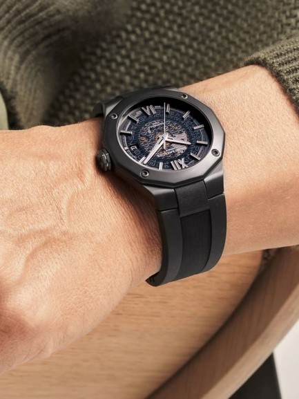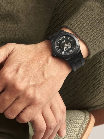 The Baume & Mercier 10617 Riviera watch combines a 42mm round shaped black stainless steel case and dodecagonal bezel with a black rubber strap and push button clasp. It has a skeleton analogue dial with luminescent hands and a date display which is protected beneath scratch resistant sapphire crystal glass with an anti-glare coating. Power is generated by the Swiss made Baumatic BM13-1975A COSC certified automatic chronometer movement with 21 rubies and a power reserve of up to 120 hours. This model also has a sapphire crystal case back and a water resistance of up to 100 metres.