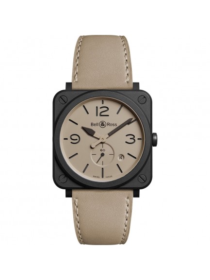 This Bell & Ross watch combines a 39mm square shaped matte black ceramic case and a beige coloured calfskin leather strap with a traditional buckle fastening. It has a beige analogue dial with Super-LumiNova filled hands and hour markers and a date window between four and five o-clock. The dial is protected beneath sapphire crystal glass with an anti-reflective coating. Power is generated by the quartz movement. This model has a water resistance of up to 100 metres.