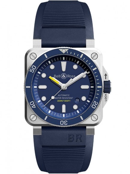 This technical dive watch features a blue rubber strap and dial with a satin polished stainless steel squared case. As well as a 300 metre water resistance, the watch has a unidirectional rotating bezel, Superluminova coated hands and hour markers, scratch resistant sapphire crystal glass with anti-reflective coating, and a date display. The calibre BR-CAL.302 automatic mechanical movement powers the watch.