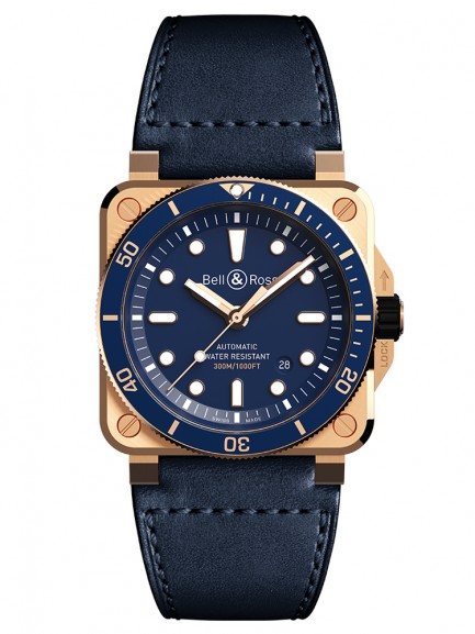 Limited to 999 pieces, this Bell & Ross watch combines a 42mm square shaped Satin-polished CuSn8 bronze case. It has a blue analogue dial with gold tone Super-LumiNova filled hands and hour markers and a date window between the 4 & 5 o’clock position. The dial is protected beneath sapphire crystal glass with an anti-reflective coating. Power is generated by an automatic movement. This model has a water resistance of up to 300 metres and has been finished with a blue calfskin leather strap with a traditional buckle fastening.