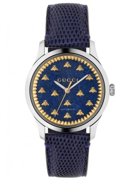 Crafted in stainless steel, this G-Timeless watch features a blue Lapis dial adorned with the iconic bee motif. The watch boasts an automatic movement with a skeletal case back. The watch is finished with a soft blue leather strap and a traditional buckle fastening.