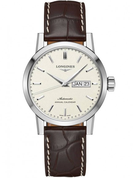 A 40mm stainless steel case and brown alligator leather strap with buckle clasp. Scratch resistant sapphire crystal with several layers of anti-reflective coating applied to the underside protects the dial, which consists of a cream colour with silver Super-LumiNova coated hands and indexes. Functions also include an annual calendar displaying the month and date. Power is generated by the L897 self winding mechanical movement with a 64 hour power reserve which can be seen through the transparent sapphire crystal case back.