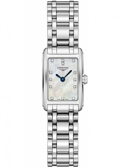 This beautiful timepiece features a sensational rectangular dial casing mounted onto a sophisticated link bracelet, crafted in sublime stainless steel. Protected under the impressive sapphire crystal glass section is the phenomenal dial, consisting of a sophisticated mother of pearl background with 13 twinkling diamonds arranged around the outside acting as glimmering hour markers. The piece is finished with a pair of bold blue dial hands and a push deployment clasp fastening for added peace of mind.