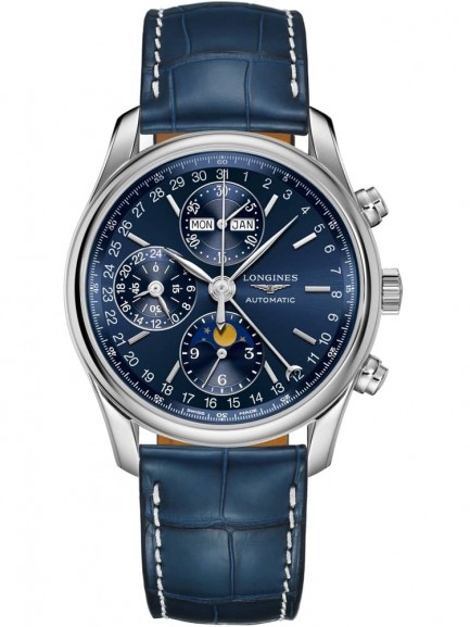 A 40mm stainless steel case is teamed with a blue alligator leather strap and triple safety folding clasp with push button. Scratch resistant sapphire crystal protects the dial, which consists of a sunray blue fade with silver polished hands and indexes. Functions include: a 24 hour indicator at 9 o’clock, a date display represented by the central half moon hand, a moon phase display at 6 o’clock, and a day/month dial at 12 o’clock. Power is generated by the L687 automatic movement with a 54 hour power reserve, which can be seen through the transparent sapphire crystal case back.