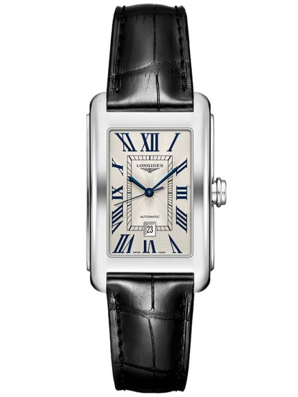 Introducing the mens DolceVita strap watch from Longines, a suave classic design that is sure to get noticed. The polished stainless steel rectangular case is fitted with scratch resistant sapphire crystal glass and a black alligator leather strap. The rectangular guilloche pattern dial features full roman numeral figures and a date window at 6 o clock.