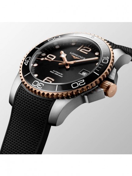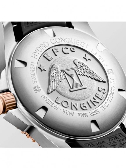 The Longines L3.781.3.58.9 HydroConquest watch combines a 41mm round shaped stainless steel case and black rubber strap with a push button clasp. It has a black analogue dial with a date display and Super-Luminova coated hands which are protected beneath scratch resistant sapphire crystal glass with several layers of anti-reflective coatings applied to both sides. Power is generated by the Calibre L888 automatic movement with a power reserve of approximately 72 hours. This model also has a lug distance of 21mm, a unidirectional rotating ceramic bezel, and a water resistance of up to 300 metres.