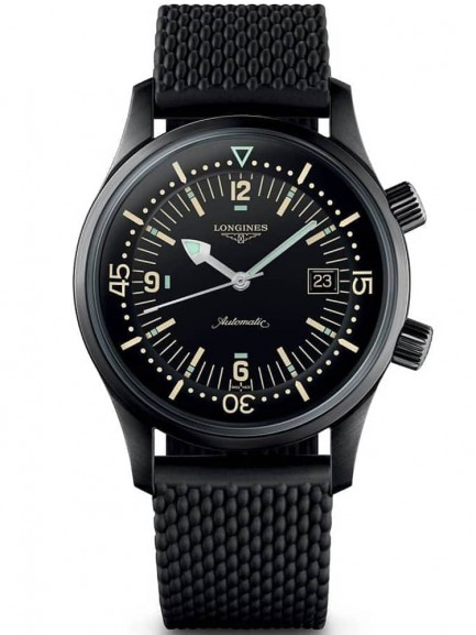 Introducing the Longines Legend Divers watch, the perfect companion for deep sea exploration. The expert Swiss craftsmanship is showcased in black ion plated steel with scratch resistant sapphire crystal glass and features a Swiss automatic movement with 64 hours power reserve and an impressive 300m water resistance. The round black dial features contemporary detailing, luminescence, accurate indices, rotating bezel and a date window with the prestigious winged Longines logo under the 12 o clock position. Complete with a textured black rubber strap and fold over titanium clasp for a secure and comfortable fit in all conditions.