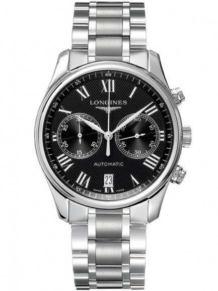 This sporty mens timepiece comes from the Longines Master collection. Consists of a round black dial complete with silver tone hands and Roman numeral hour markers along with a fully functioning date window and chronograph subdials. Fastens securely using a stainless steel bracelet.