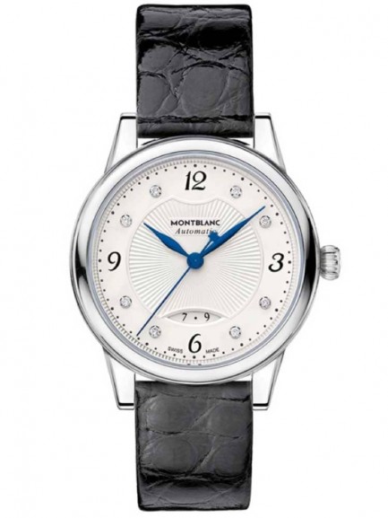 The Montblanc ladies Boheme timepiece combines the best of Swiss watchmaking with a distinctive feminine design. Powered by a quality automatic movement that can be admired through the caseback, featuring a classic look dial with luxurious diamond studded hour markers, fancy hands and an impressive date window. Complete with a comfortable black leather strap and traditional buckle for a secure fit, this timepiece is sure to satisfy even the most refined tastes.