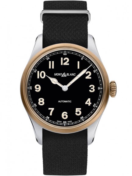 This spectacular mens timepiece pays homage to Montblanc’s initial release back in 1858. Consisting of a vintage style dial in black along with luminescent hands and bold Arabic numeral hour markers powered by the automatic movement. A picture of the Mont Blanc has been engraved on the case back, along with a compass and two crossed ice pickaxes. Fastens seurely using a black Nato strap.