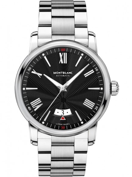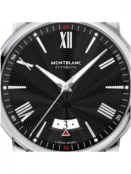 The Montblanc 4810 watch is a classic example of the brands craftsmanship and quality. The black star patterned guilloche dial features silver tone roman numerals and hour indicators as well as a date display and Superluminova coated dial hands which are powered by an automatic movement. The Calibre MB 24.17 movement hosts a 38 hour power reserve and 26 jewels vibrating 28,800 times per hour, ensuring precise and consistent timekeeping. Domed sapphire crystal with anti-reflective coating fortifies the dial and allows a 50 metre water resistance.