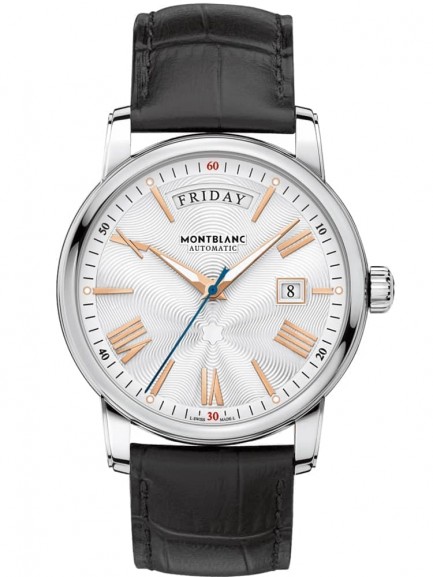A fashionably stylish timepiece featuring a unique silver tone dial that emanates an engraved star-like pattern. Functionality includes a 12 hour analogue display using luminescent hands and rose gold Roman numeral hour markers as well as separate day and date windows each controlled by precision automatic movement. Fastens comfortably using a black genuine leather strap and stainless steel case.