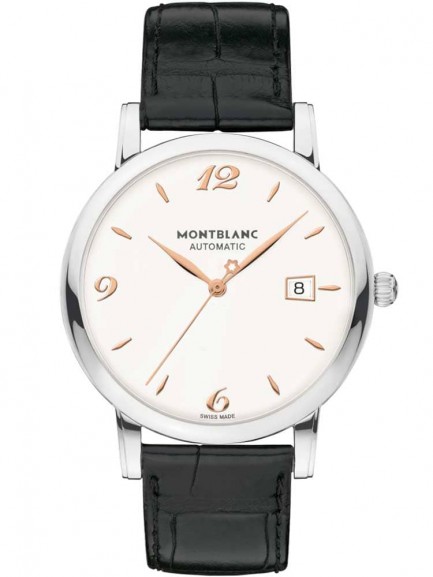 The Montblanc Star is a sophisticated and refined timepiece to suit all occasions, polished to perfection so it shines like a star. The sumptuously smooth steel case is adorned with a textured crown, scratch resistant sapphire crystal glass and slender horns, adding to the prestigious style. The round minimalist dial design is embellished with on-trend rose gold tone detailing, with attractive Arabic numerals, baton hour markers and a date window for extra functionality. Powered by an impressive Swiss automatic movement and finished with a luxurious black leather strap, fastening in a traditional buckle for a secure and comfortable fit.