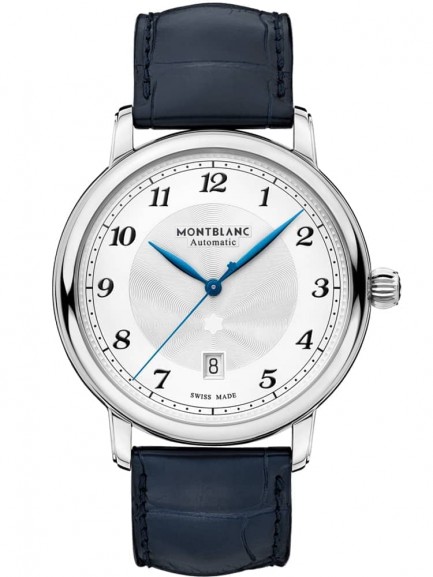 A luxurious mens timepiece from the Montblanc star legacy collection which consists of a silver tone dial complete with blue leaf shaped hands and black Arabic numeral hour markers along with a fully functioning date window. Fastens comfortably using a blue genuine leather strap.