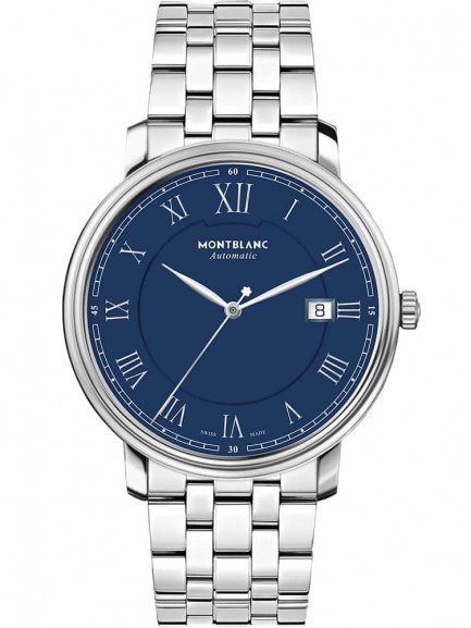 This Tradition Montblanc watch combines a stainless case and bracelet with a bold blue dial. Anti-reflective coated sapphire crystal protects the dial, which features a trio of automatic powered dial hands, Roman numeral hour markers and date display.