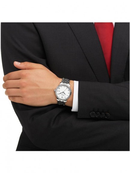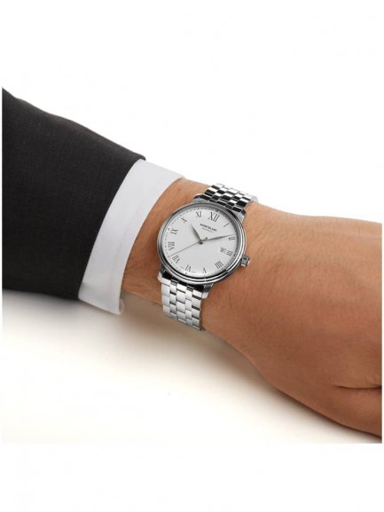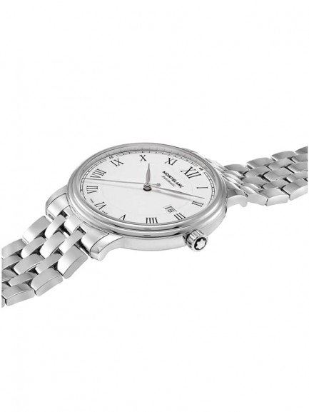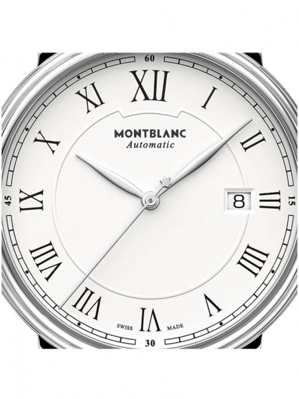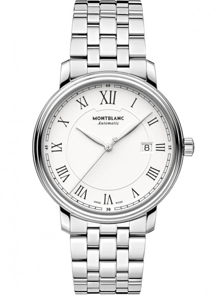 Montblanc introduce this stunning Swiss made watch featuring a stainless steel case and bracelet. The white dial hosts black roman numerals, a date display and a trio of silver tone dial hands powered by an automatic movement with a 38 hour power reserve and 26 jewels vibrating 28,800 times per hour. Domed sapphire crystal with anti-reflective properties protects the dial and allows the piece to possess a 30 metre water resistance.