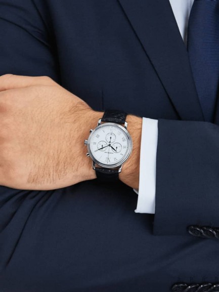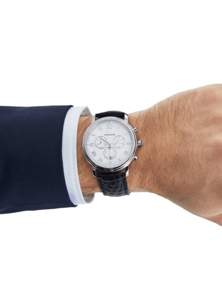 A traditionally styled mens timepiece which features a distinctive Montblanc design. The clean white dial sports Roman numeral hour markers along with slim fitting hands in order to showcase the time. Three chronograph subdials work in conjunction with each other in order to display elapsed time, alongside a functioning date window.