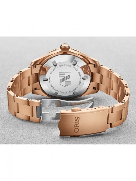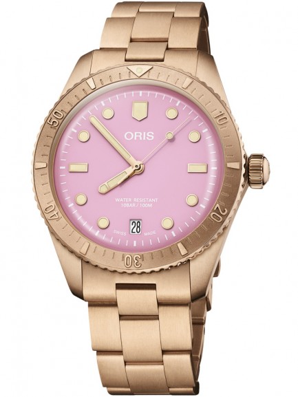 The Oris 01 733 7771 3158-07 8 19 15 Divers Sixty-Five watch combines a 38mm round shaped bronze case and rose gold bronze bracelet with a push button deployment clasp. It has a pink analogue dial which is protected beneath sapphire crystal glass. Power is generated by the automatic movement. This model also has a water resistance of up to 100 metres.