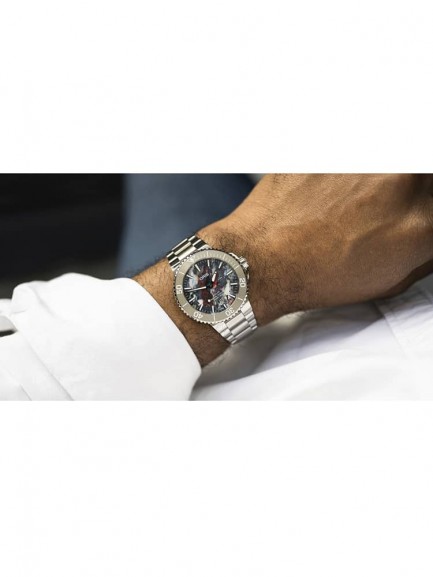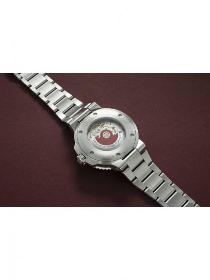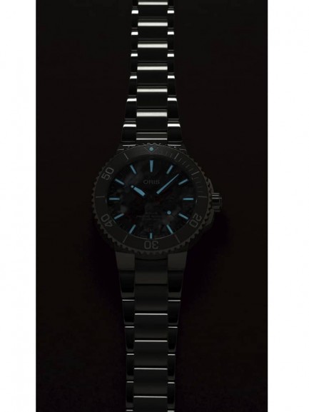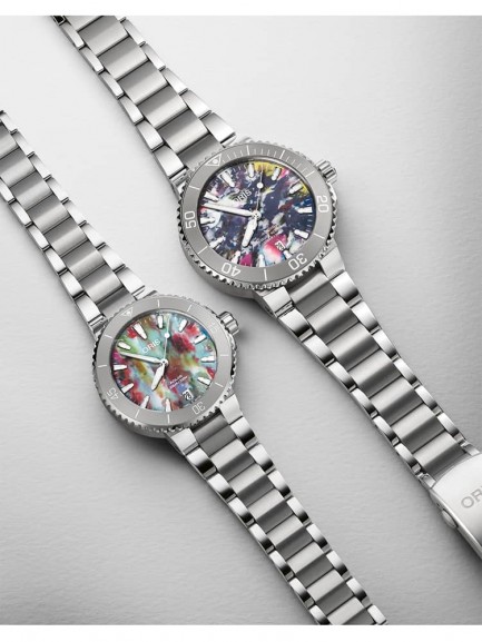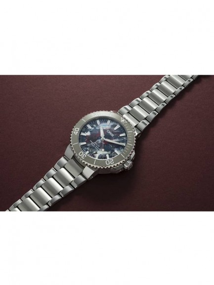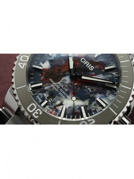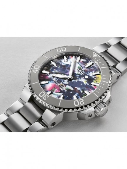 The Oris 01 733 7766 4150-SET Aquis Date watch is a step in the right direction for reducing the world’s ocean plastic crisis, and combines a 41.5mm round shaped stainless steel case and bracelet with a fold over clasp. The multi-coloured analogue dial is made from the PET plastic recycling process which produces random patterns meaning each dial is totally unique. The dial has Superluminova coated hands and indices which are protected beneath domed scratch resistant sapphire crystal glass with an anti-reflective coating inside. Power is generated by the Oris 733 automatic movement with 26 jewels and a power reserve of up to 38 hours. This model also has a transparent mineral crystal case back, a screw-in security crown, and a water resistance of up to 30 metres.