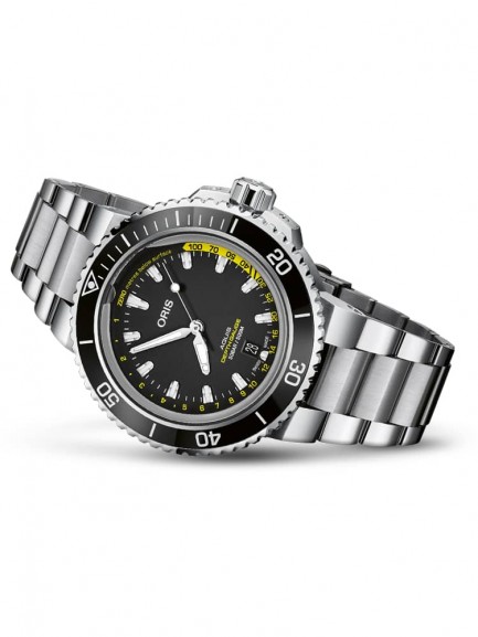 The Oris 01 733 7755 4154-SET MB Aquis watch is patented and the first of its kind to measure depth using a unique gauge built into the sapphire crystal which allows water to enter the watch. Known affectionately as ‘the watch with a hole’, the Aquis Depth Gauge uses the scientific principles of the Boyle-Mariotte Law to create a gauge that clearly measures depth during a dive. The patented system works by allowing water through a hole cut into the sapphire crystal at 12 o’clock and into a channel milled around the outer edge of the crystal. This creates a watermark that corresponds to a gauge clearly indicated in yellow on the dial.