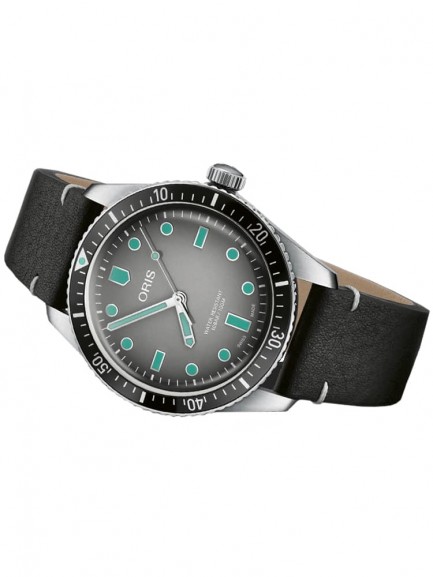 The Oris 01 733 7707 4053-07 5 20 89 Divers Sixty-Five watch combines a 40mm round shaped stainless steel case and black leather strap with a fold over clasp. It has a grey analogue dial with Superluminova coated hands and indices which is protected beneath domed scratch resistant sapphire crystal glass with an anti-reflective coating inside. Power is generated by the Oris 733 automatic movement with 26 jewels and a power reserve of up to 38 hours. This model also has a screw-in security crown, and a water resistance of up to 100 metres.