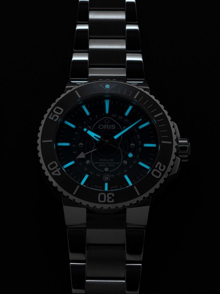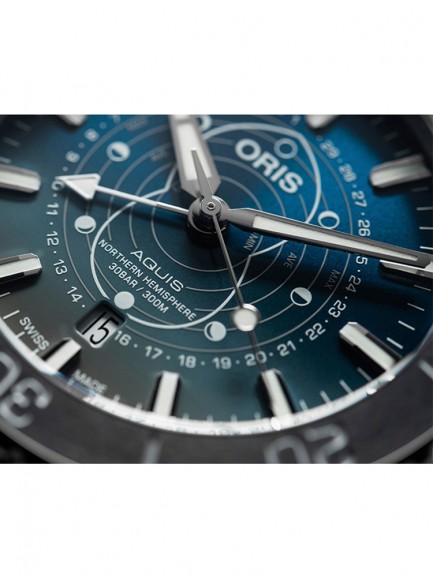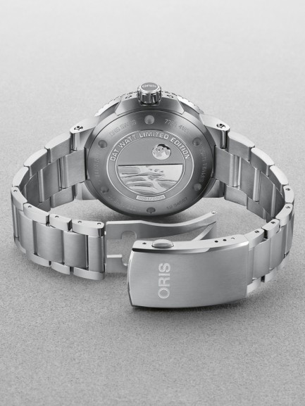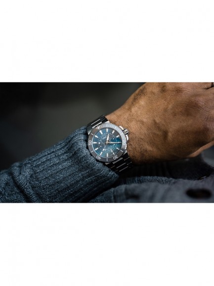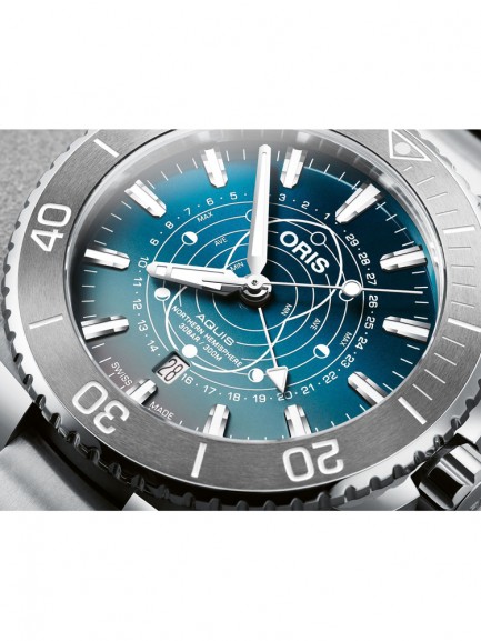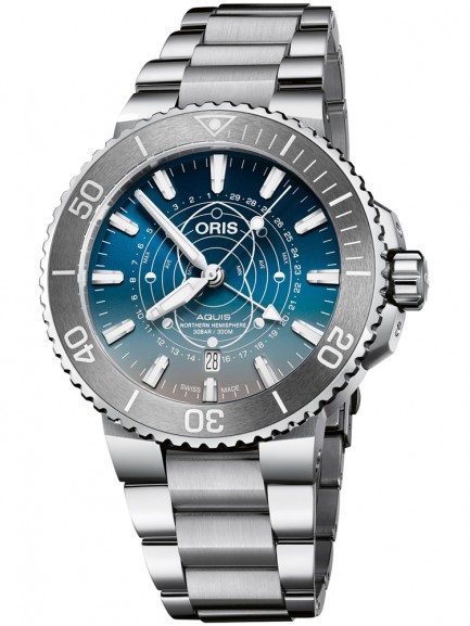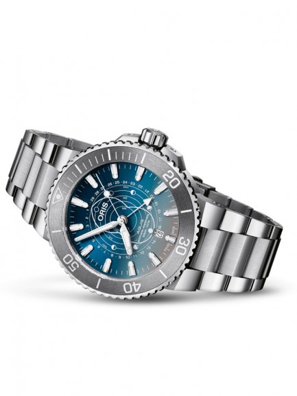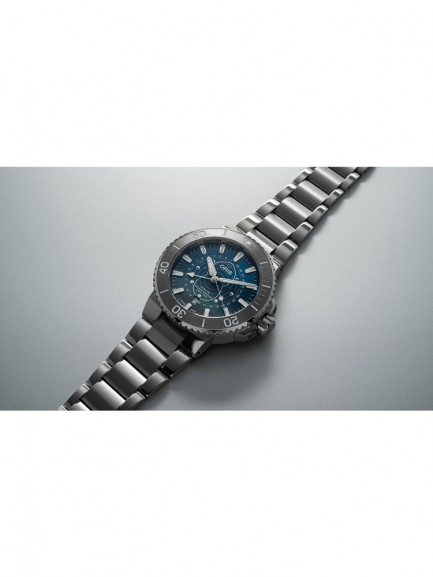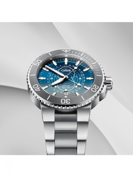 The Oris 01 761 7765 4185-SET Aquis watch combines a 44mm round shaped stainless steel case and silver stainless steel bracelet with a push button deployment clasp. It has a blue analogue dial which is protected beneath sapphire crystal glass. Power is generated by the automatic movement. This model also has a water resistance of up to 300 metres.