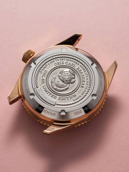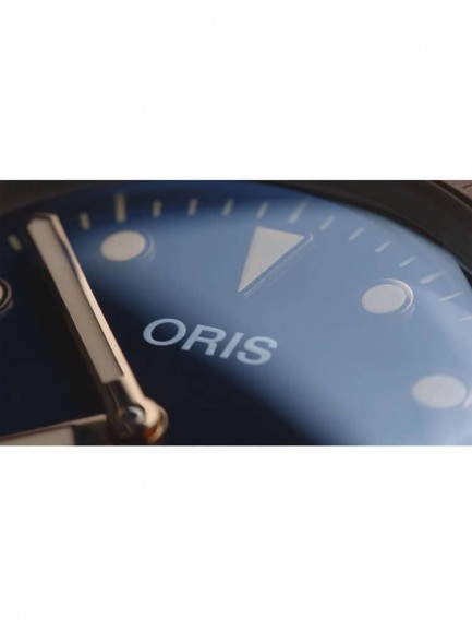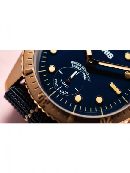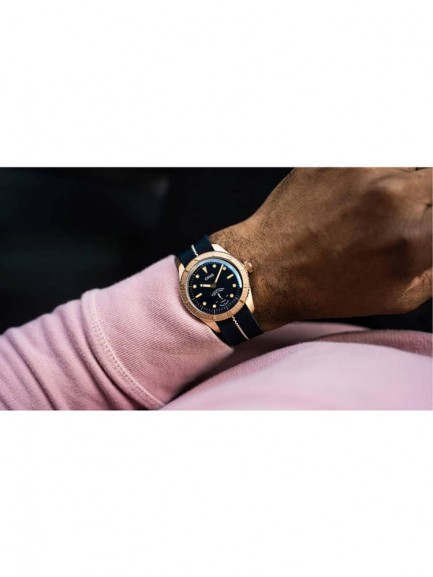 The Oris 01 401 7764 3185-SET Divers watch is limited to just 2000 pieces and combines a 40mm bronze case and fabric strap with a buckle clasp. It has a blue dial with Superluminova coated hands and a small seconds sub-dial, which is protected beneath domed scratch resistant sapphire crystal glass with an anti-reflective coating on the inside. Power is generated by the Oris 401 automatic movement with 24 jewels and a 120 hour power reserve. This model also has a water resistance of up to 100 metres.