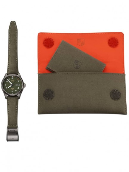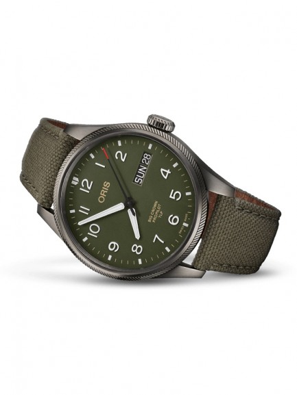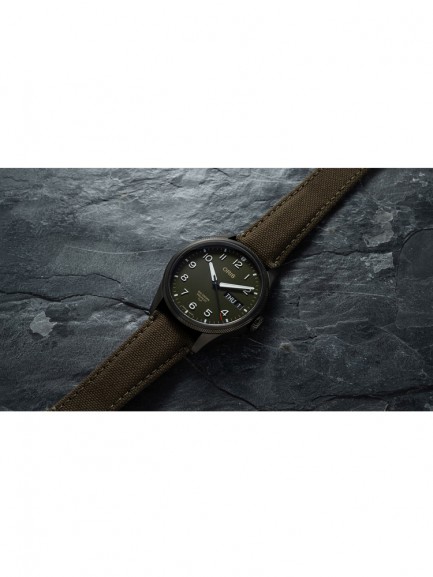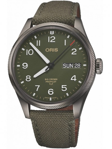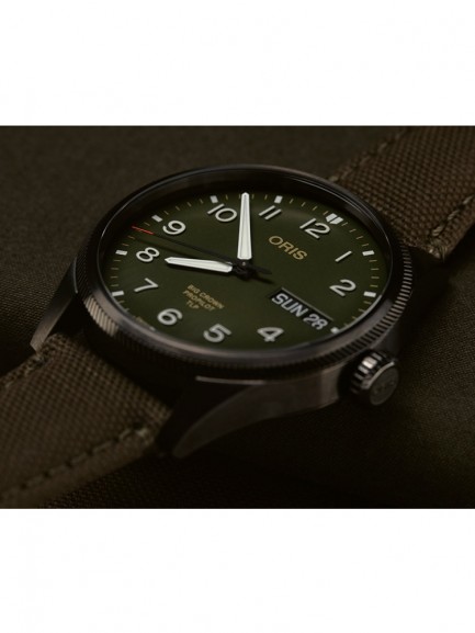 The Oris 01 752 7760 4287-SET Big Crown watch combines a 44mm round shaped stainless steel case and green fabric strap with a fold over clasp. It has a green analogue dial with a day/date display, and Superluminova coated hands and numerals all of which is protected beneath domed scratch resistant sapphire crystal glass with an anti-reflective coating inside. Power is generated by the Oris 752 automatic movement with 26 jewels and a 38 hour power reserve. This model also has a screw-in security crown, an engraved case back, and a water resistance of up to 100 metres.