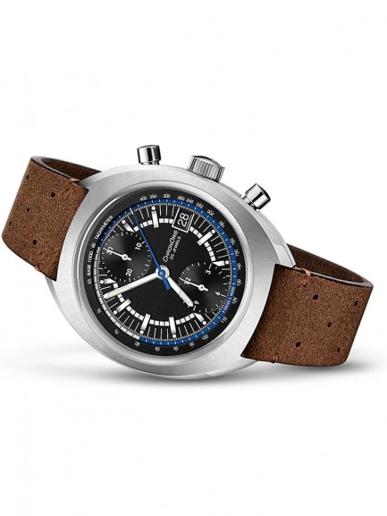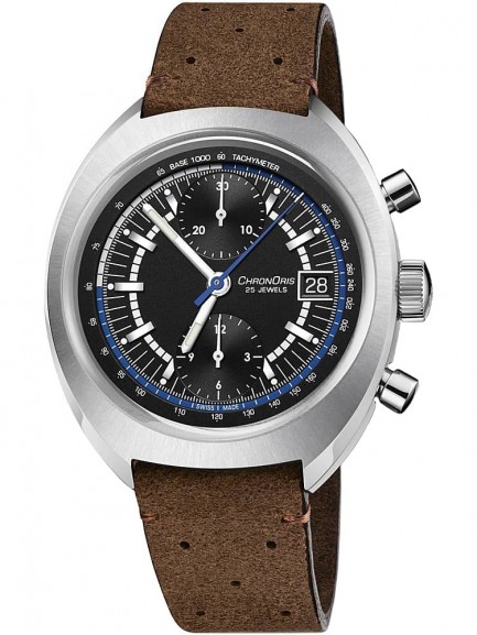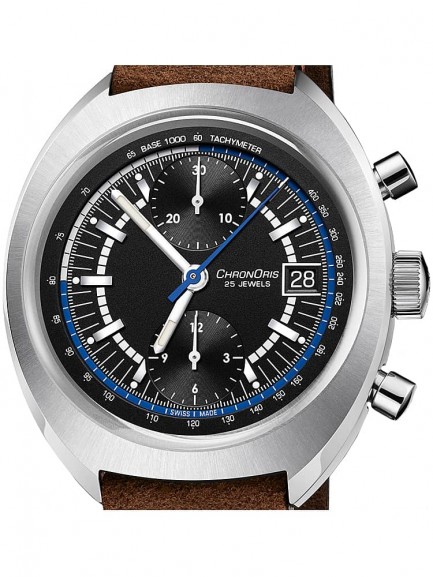 The inclusion of the ChronOris mechanism is a new feature, and a welcome one. The black dial with tachymeter and big date display features hands that record hours, minutes and quarter seconds,
