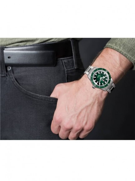 A Rado Captain Cook series watch combining a 42mm stainless steel case and bracelet with a push button clasp. It has a green dial and bezel and is powered by an automatic movement with an 80 hour power reserve. The watch also weighs 165 grams.