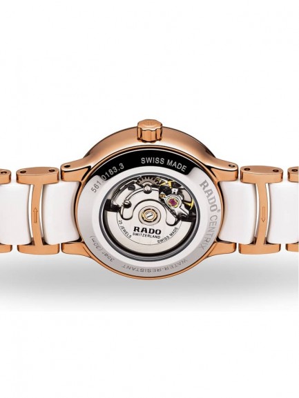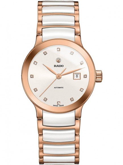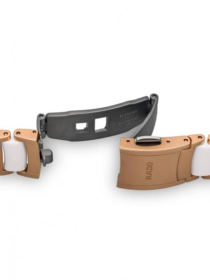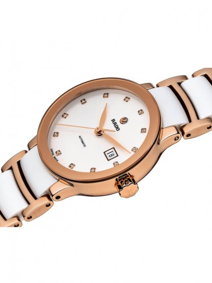 As Rado’s most popular collection, the Centrix series hosts a versatile range of models in varying size and colour combinations. This example has a rose gold plated stainless steel case with high-tech white ceramic and rose gold plated steel bracelet. Sapphire crystal protects the white dial, which has rose gold hands and diamond hour markers in addition to a date display. Power is generated through an automatic movement.