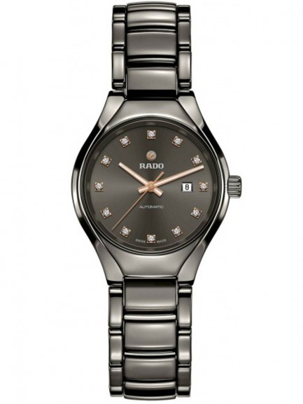 An ultra stylish ladies wristwatch from Rado, crafted from high-tech grey ceramic. A sturdy sapphire crystal glass dome protects the dial, which consists of a grey sunray background hosting 0.096ct set diamond hour markers and a trio of gold-tone luminescent slim hands, minutes and seconds. The brand has also added a date display next to the 3 o’clock indicator providing a useful everyday feature, with the final aesthetic touches supplied by Rado’s signature labelling.