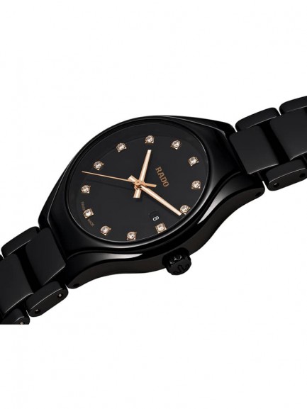 The award winning True series from Rado features sleek contemporary designs. This example has a 30mm high-tech black ceramic case and bracelet and closes with a push button clasp. Sapphire crystal protects the dial, which is composed of a black backdrop with luminescent rose dial hands, diamond hour markers, and a date display, all powered by a quartz movement.