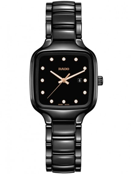 The Rado R27080702 True Square watch combines a 29mm square shaped black high-tech ceramic case and black ceramic bracelet with a double push button clasp. The ceramic used for this watch is lightweight and also scratch resistant. It has a black analogue dial with rose gold tone luminescent hands, a date display, and 12 diamond hour markers totalling 0.096 carat, all of which is protected beneath scratch resistant sapphire crystal glass. Power is generated by the quartz movement. This model also has a water resistance of up to 50 metres and weighs 67 grams.