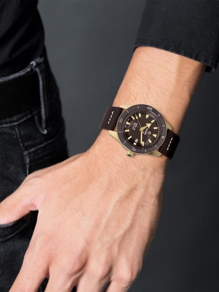 Inspired by the original 1962 model, this Captain Cook timepiece is brought to life for the 21st century. Combining vintage details and styling with up-to date features, the Captain Cook watch will stand the text of time. A brown dial is accentuated by a bronze case for the perfect combination of ancient and modern materials.