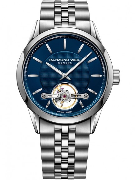 A Raymond Weil watch from the Freelancer series featuring a 42mm stainless steel case and bracelet. The watch fastens with a folding double push button clasp and has sapphire crystal protecting the dial, which consists of a blue patterned backdrop with silver dial hands and indexes as well as a visible balance wheel. Powering the watch is a RW1212 mechanical mechanism with automatic winding, which can be seen through the transparent sapphire crystal case back.