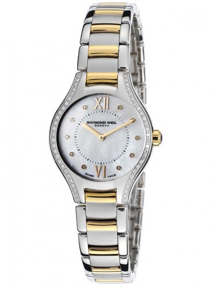 The two toned themed watch by Raymond Weil adds a touch of class to your style. The smart mother of pearl dial is complemented by gorgeous diamond hour markers. A great watch for any occasion.