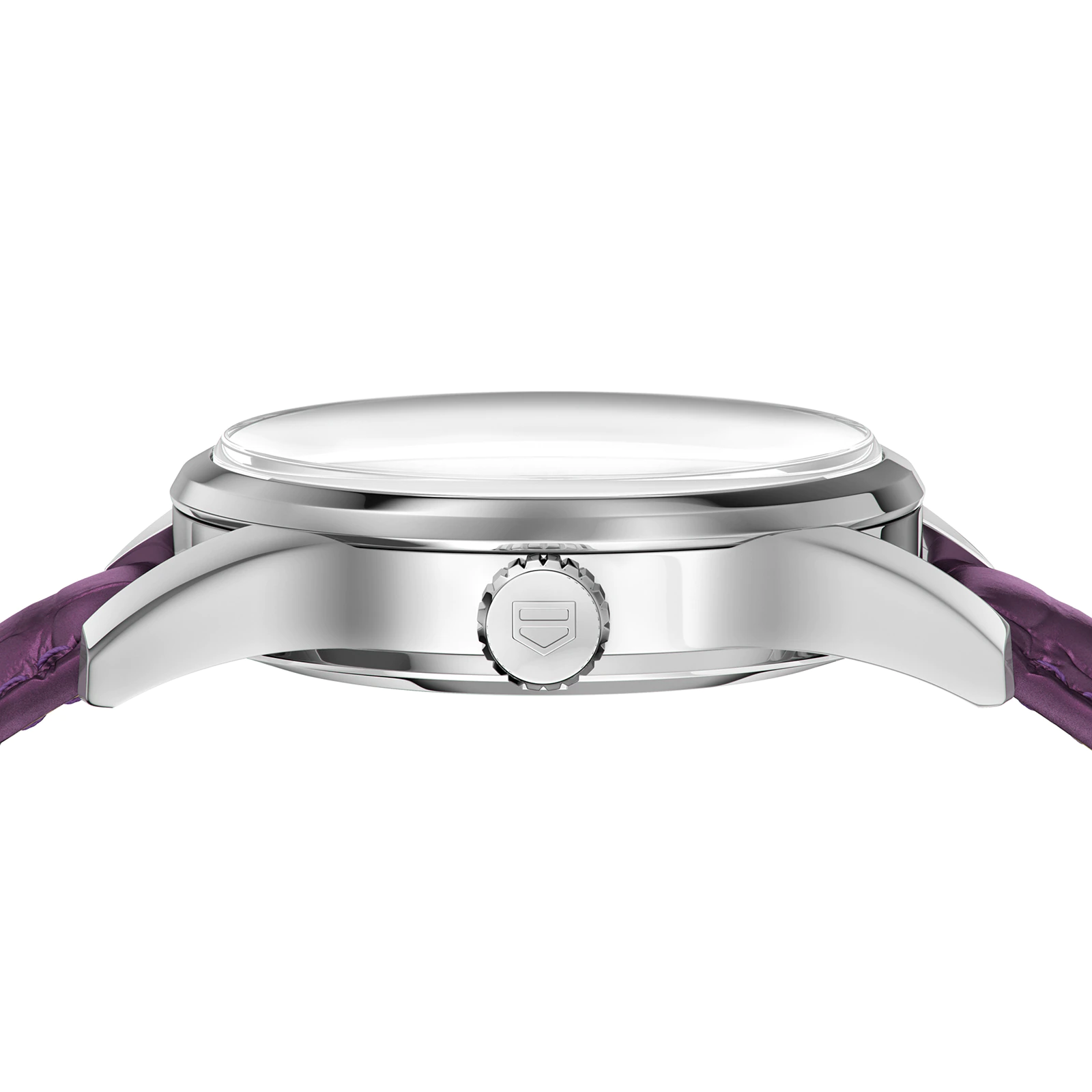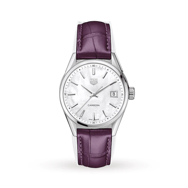 Presented on a striking purple alligator leather strap, the Carrera is housed by a durable 36mm stainless steel case. The dial is set on the timeless shimmering lustre of the natural white mother-of-pearl, providing a beautifully chic contrast.