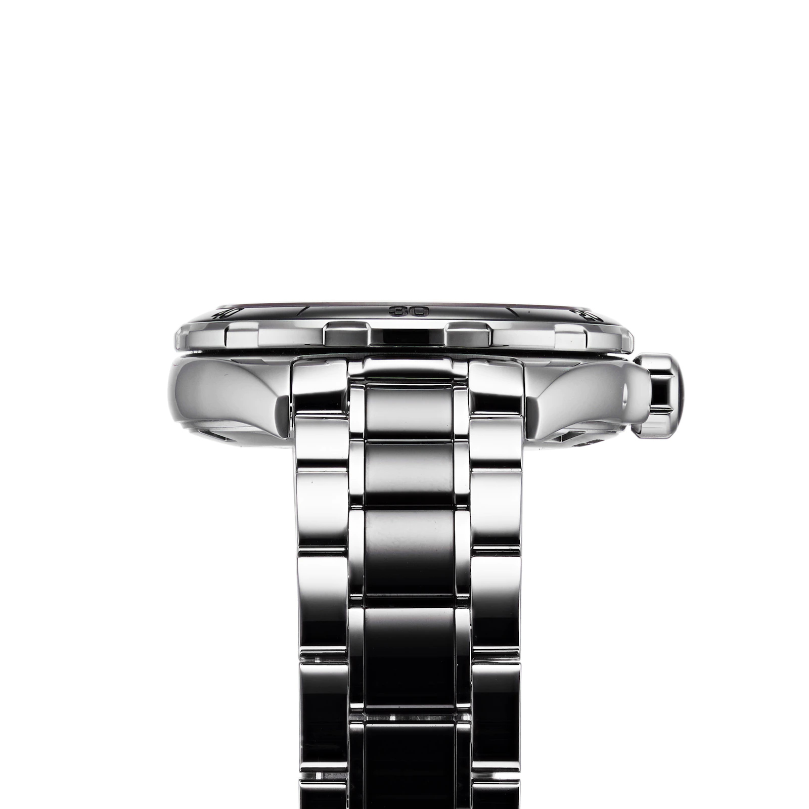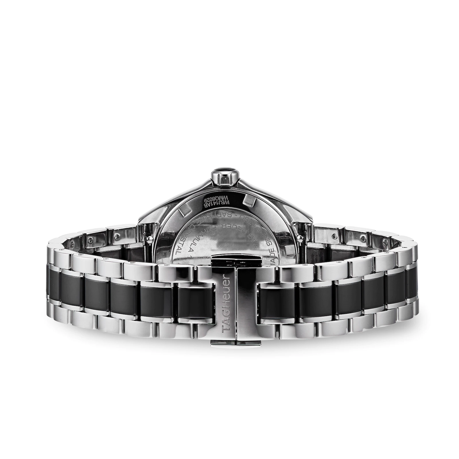 The perfect ladies watch for today’s powerful women, this TAG Heuer Formula 1 beautifully combines both a sporty and elegant aesthetic with an unbeatable Swiss quartz movement. Described by TAG Heuer as the perfect marriage of fashion and functionality, this stunning TAG Heuer ladies watch makes use of precious materials like stainless steel and ceramic to create an unmissable finish on the wrist while also housing a quartz calibre considered one of the most reliable and accurate made in Switzerland. Instantly noticeable, the striking black dial of this TAG Heuer Formula 1 Ladies watch is decorated with the brand’s famous logo at 12 o clock, faceted indexes and sleek steel hands. The neatly sized 32mm fine brushed and polished stainless steel case is water resistant to 100 metres and moulds elegantly to the wrist thanks to the sleek lugs and sophisticated two toned black ceramic and stainless steel bracelet. Hidden within is a Swiss made quartz movement which equips the timepiece with hour, minute and seconds function, a handy date window at 3 o clock and a special End-Of-Life battery indicator feature. This TAG Heuer Formula 1 watch for women is another fine example of the brand’s ability to embody glamour and functionality within a timepiece designed specifically for ladies always on the move.