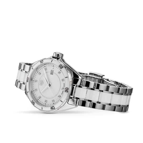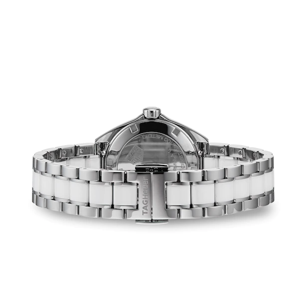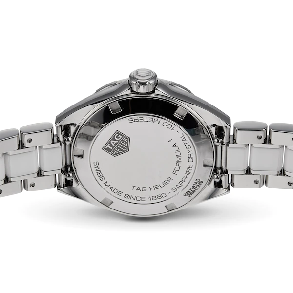 The perfect ladies watch for today’s powerful women, this TAG Heuer Formula 1 beautifully combines both a sporty and elegant aesthetic with an unbeatable Swiss quartz movement. Described by TAG Heuer as the perfect marriage of fashion and functionality, this stunning TAG Heuer ladies watch makes use of precious materials like stainless steel and ceramic to create an unmissable finish on the wrist while also housing a quartz calibre considered one of the most reliable and accurate made in Switzerland. Instantly noticeable, the striking white dial of this TAG Heuer Formula 1 Ladies watch is decorated with the brand’s famous logo at 12 o clock, faceted indexes and sleek steel hands. The neatly sized 32mm fine brushed and polished stainless steel case is water resistant to 100 metres and moulds elegantly to the wrist thanks to the sleek lugs and sophisticated two toned white ceramic and stainless steel bracelet. Hidden within is a Swiss made quartz movement which equips the timepiece with hour, minute and seconds function, a handy date window at 3 o clock and a special End-Of-Life battery indicator feature. This TAG Heuer Formula 1 watch for women is another fine example of the brand’s ability to embody glamour and functionality within a timepiece designed specifically for ladies always on the move.
